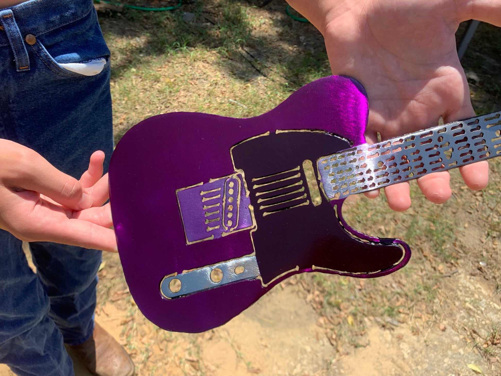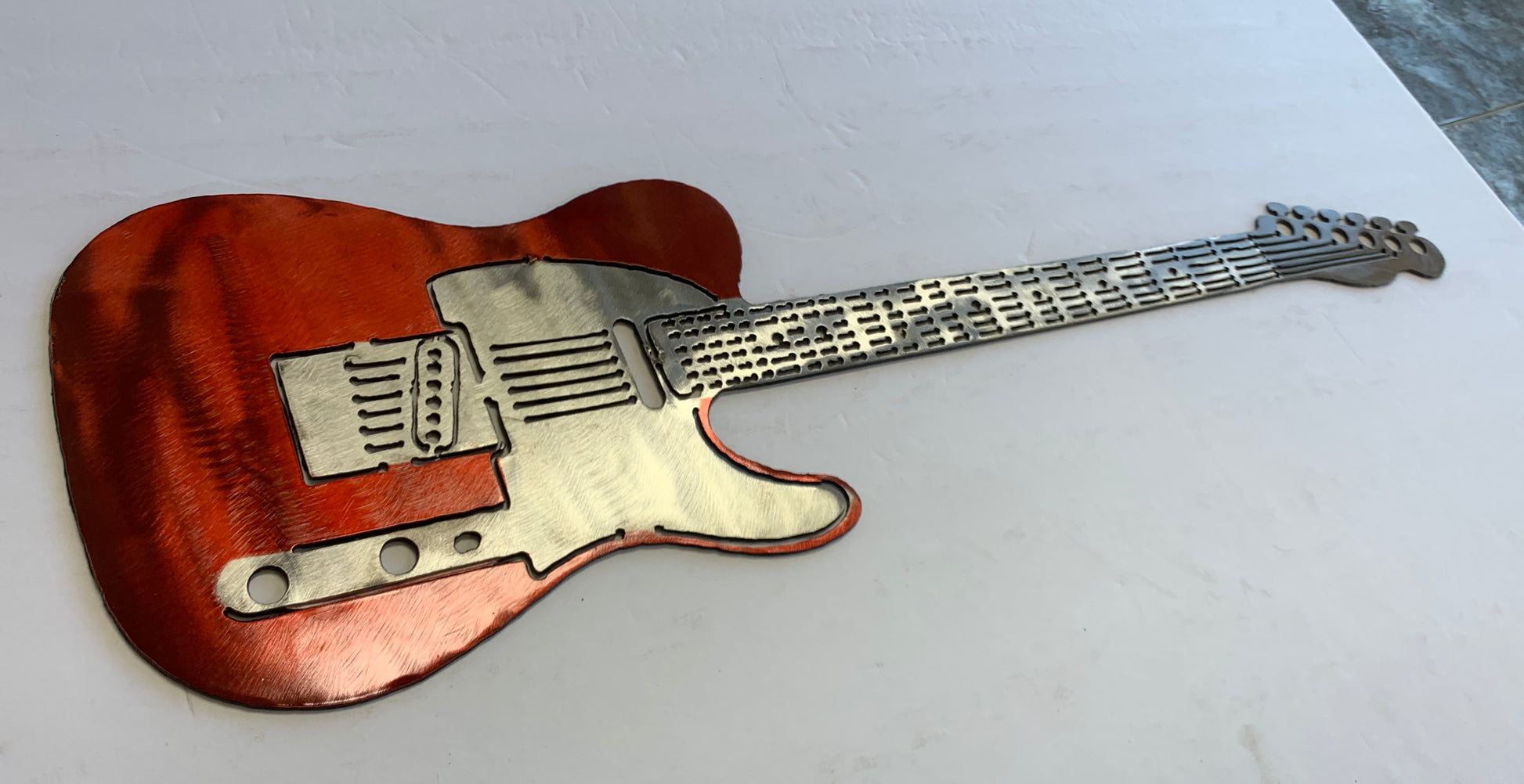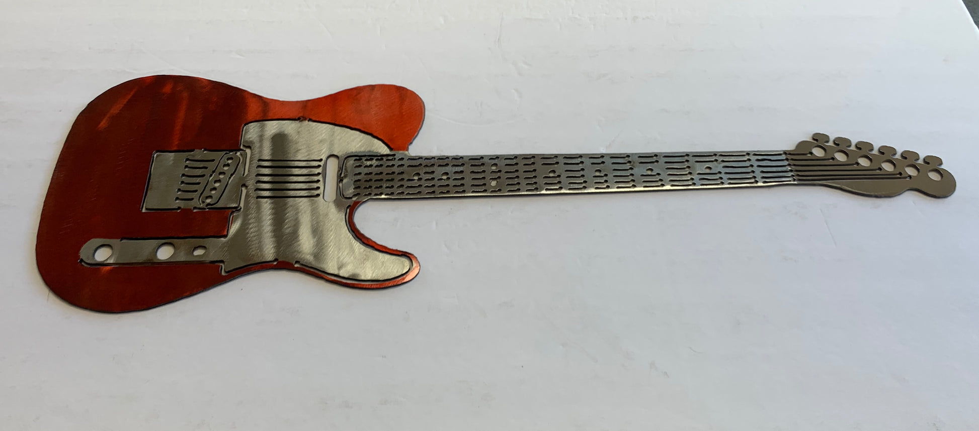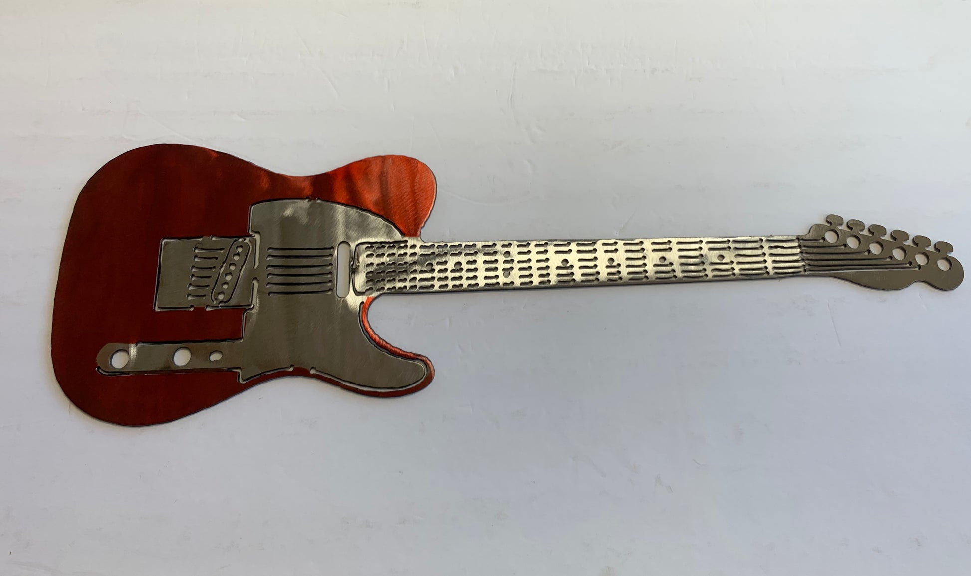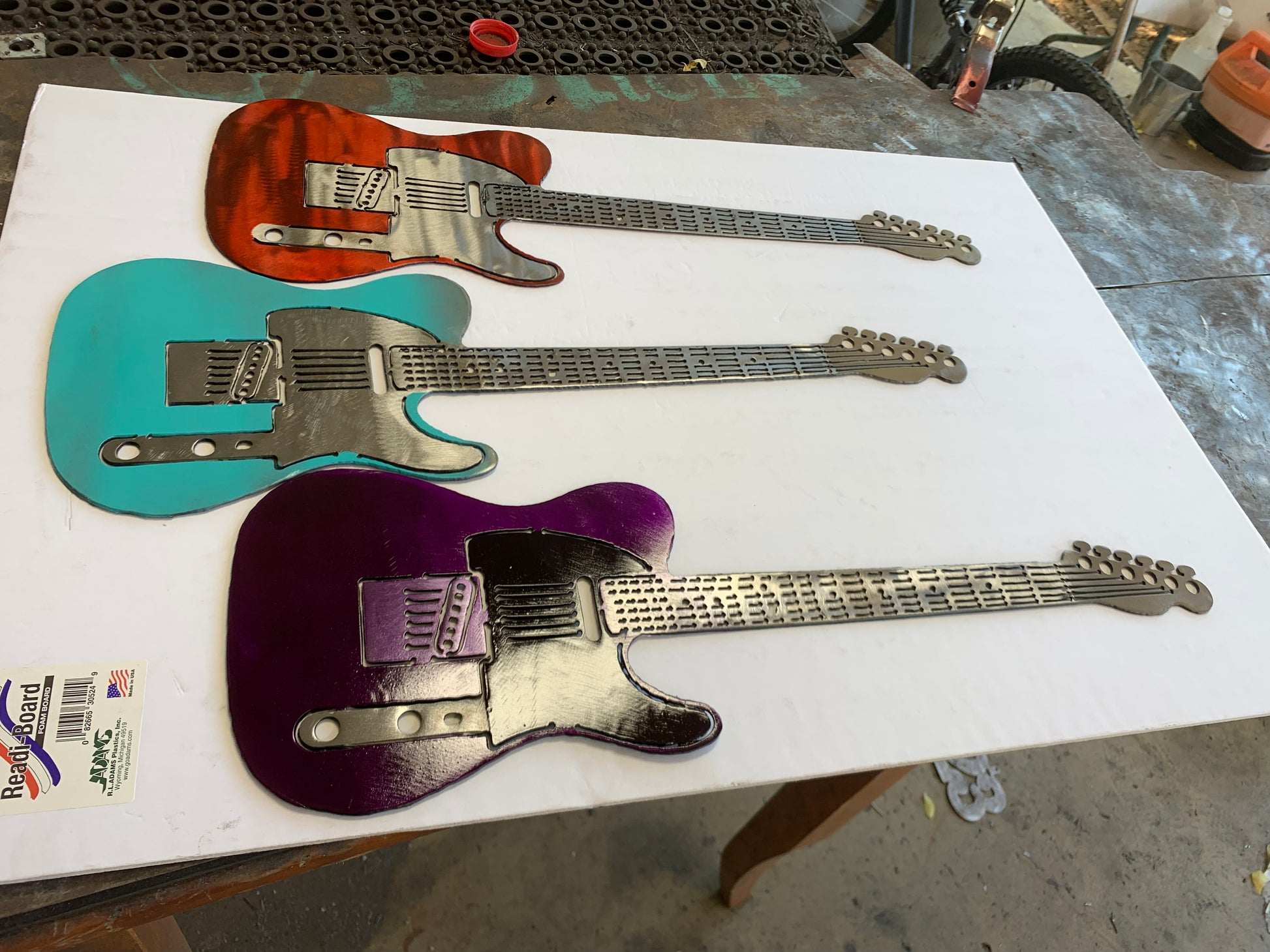 These metal art guitars are AWESOME! They are designed and painted by my 15 year old son Logan. He does a Stratocaster, a Les Paul, and a Telecaster version. He'll do some custom colors. They're 10 1/2 inches tall by 32 inches wide.